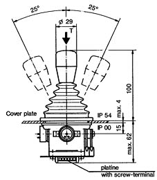 The JS1003 joystick is a robust and durable single axis joystick for use in harsh environments and is available in two standard options. Option 1 Spring return to centre. Option 2 Friction clutch. Both versions are fitted with a dual 5K centre tapped potentiometer giving 0 ñ 100% command at the wiper. Potentiometer life is 10,000,000 operations. A dual axis version is also available with gated or free axis movement options to special order. |